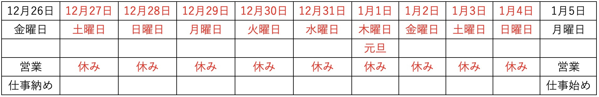 年末年始休業期間2025年12月27日(土)~2026年01月04日(日)ご迷惑をお掛けいたしますが、何卒ご了承くださいますよう宜しくお願い申し上げます。毎日寒い日が続きますので、ぜひ体調には気をつけてください。